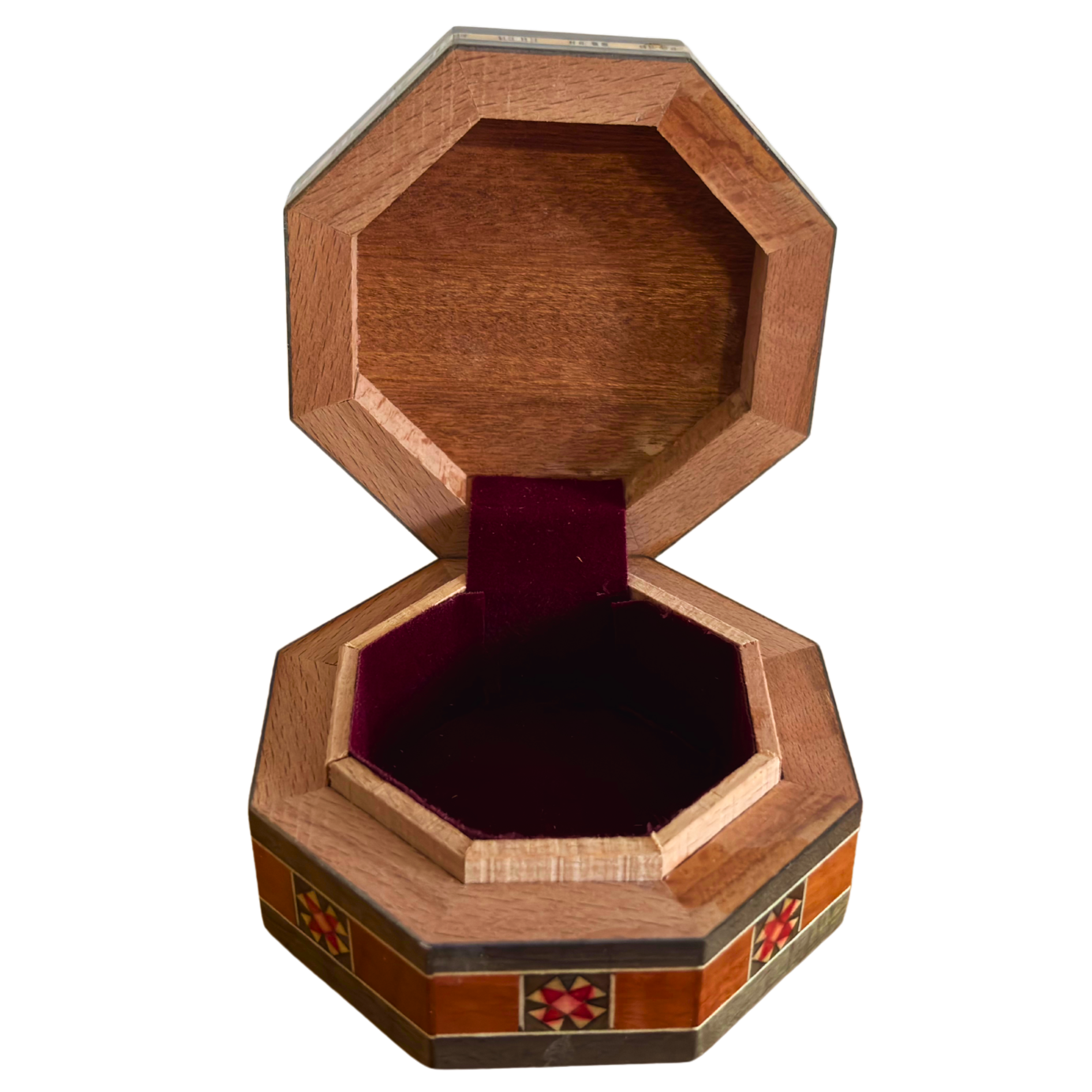 استمتع بسحر هذا الصندوق الصغير الثماني الدمشقي، المصنوع بدقة يدوية من خشب الجوز والزان والليمون والصنوبر الأصفر. مزين بترصيع لامع من صدف اللؤلؤ، وشكله الفريد ذي الجوانب الستة ونقوشه الهندسية المعقدة تبرز فن الشرق الأوسط التقليدي.