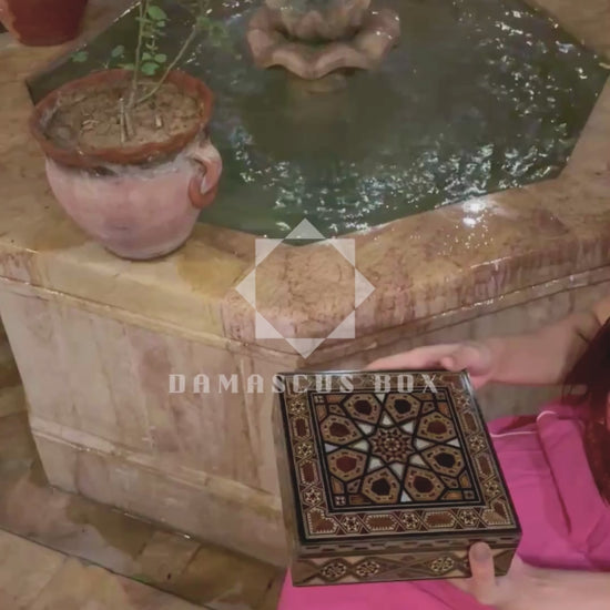 تمت صناعة هذا الصندوق يدويًا من خشب الجوز والورد والكينا والزان والليمون، ومطعّم بـ صدف طبيعي أصيل ليشكل انسجامًا فنيًا بين الخامات الطبيعية والتراث الدمشقي العريق.