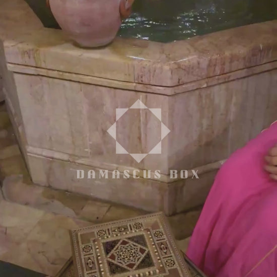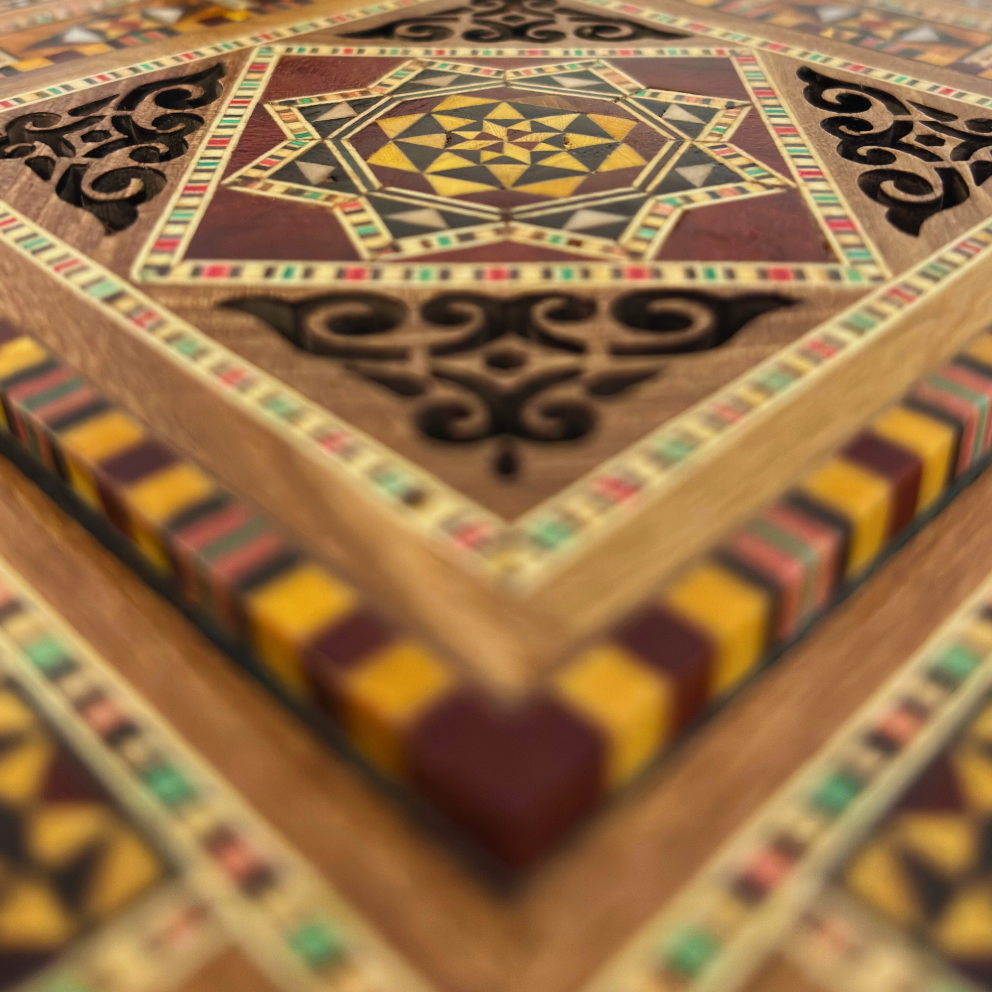تمّ تصنيع صندوق الموازييك المذهل هذا يدويًا من خشب الزان، والليمون، والجوز، والكينا، وخشب الورد في المدينة القديمة التاريخية في دمشق. تُجسّد هذه القطعة روعة الحرف اليدوية التقليدية من خلال تصميمها الفسيفسائي الأنيق، ما يجعلها طريقة راقية لتخزين المجوهرات، التذكارات الثمينة، السيجار، أو القطع الخاصة، حيث تلتقي الجماليات بالعملية.
