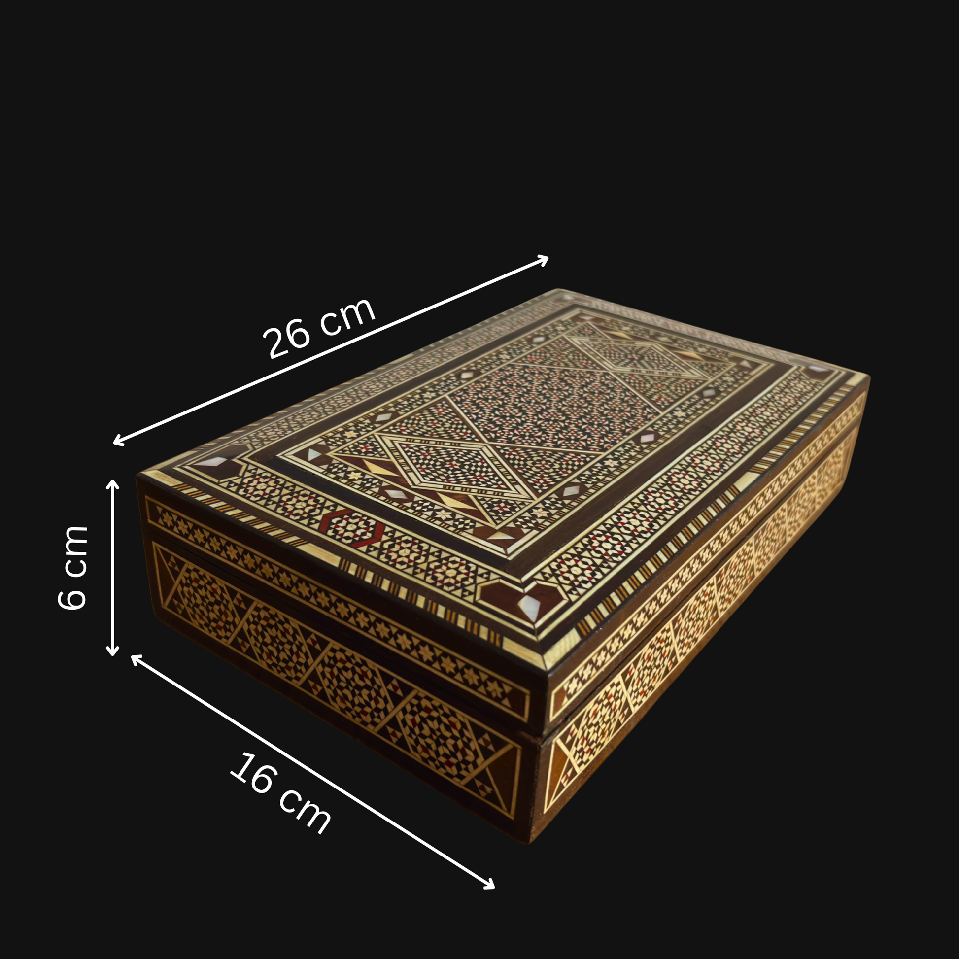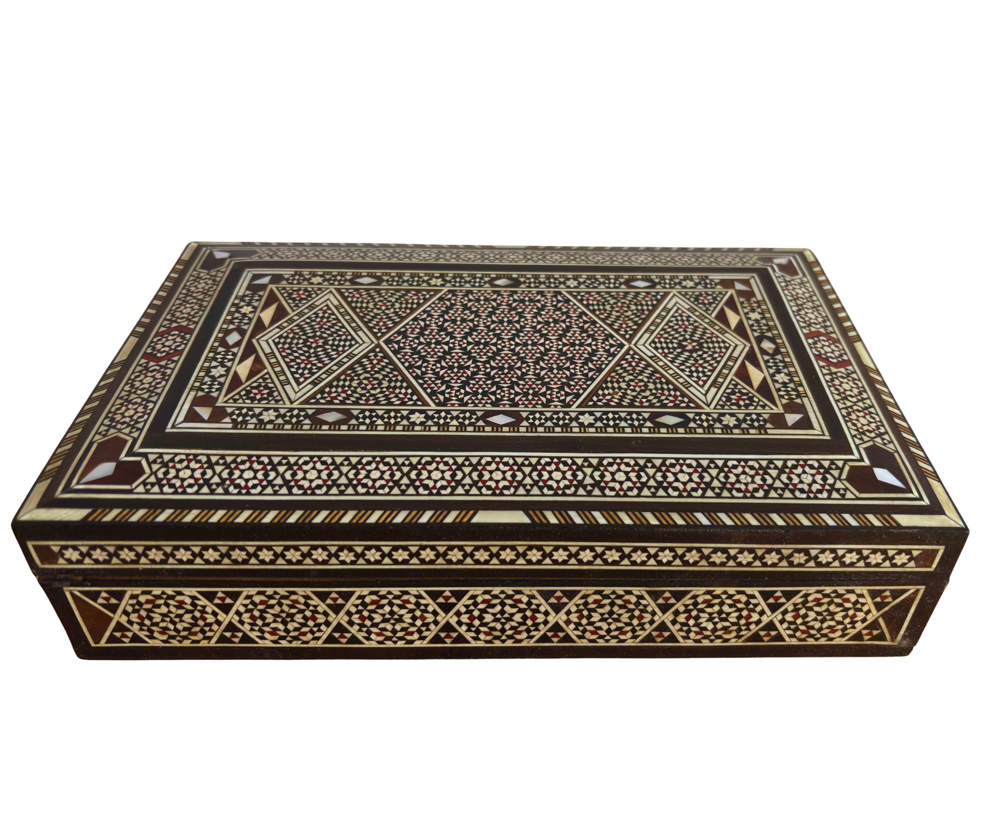هذا الصندوق الدمشقي القديم المصنوع يدويًا من عام 1970 هو كنز خالد لهواة الجمع ومحبي الحرف اليدوية الراقية. تم تزيينه بعناية بالصدف و عرق اللؤلؤ الأصلي، و يعرض أنماطًا هندسية أنيقة مستوحاة من الفن السوري التقليدي. مصنوع من خشب الجوز والزان والليمون والصنوبر الأصفر عالي الجودة، تمزج هذه العلبة بين التراث والجمال الدائم.