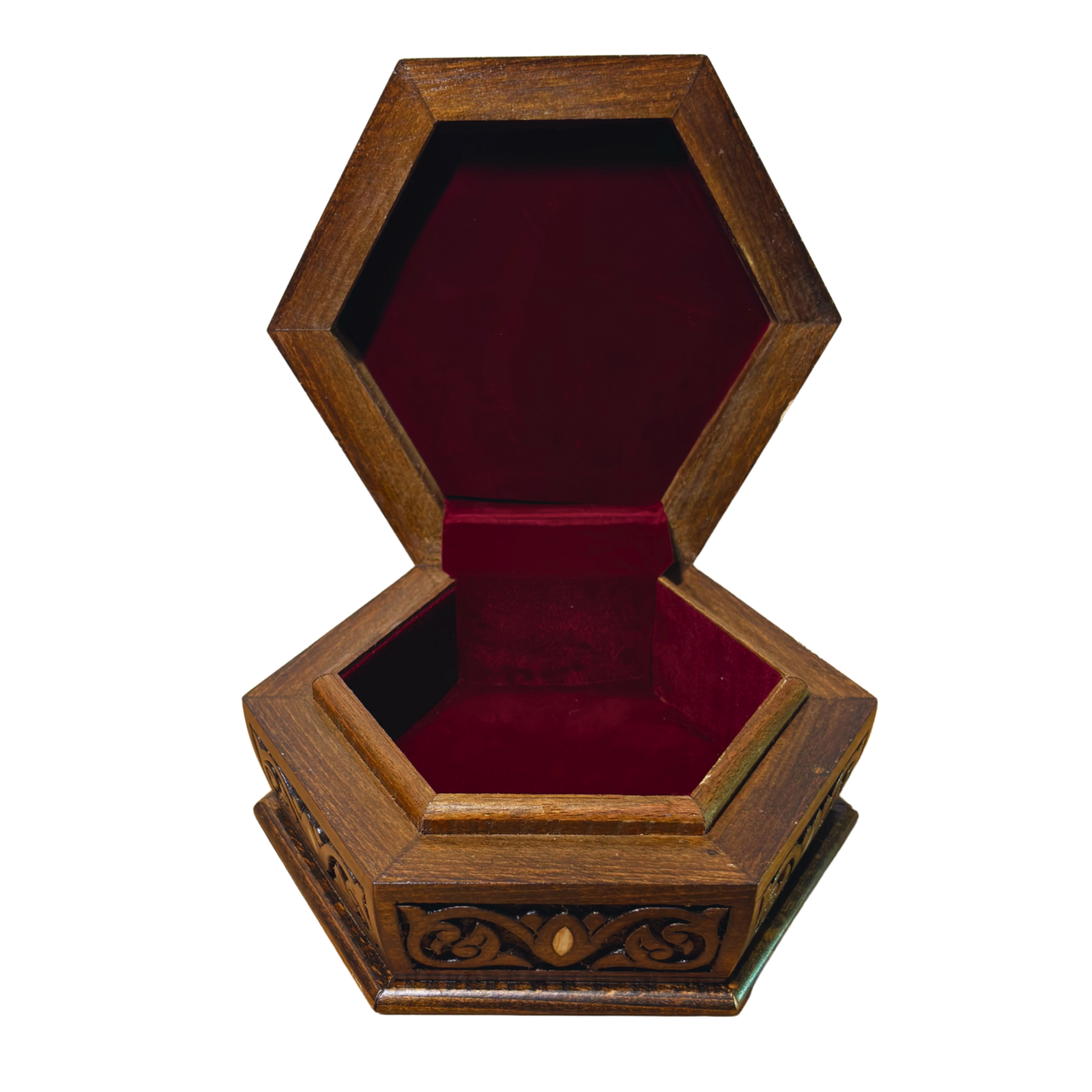 Das dunkle Walnuss-Finish verleiht der Oberfläche Tiefe und Ausdruck, während das weinrote Samtfutter Schmuck und Erinnerungsstücke stilvoll schützt.