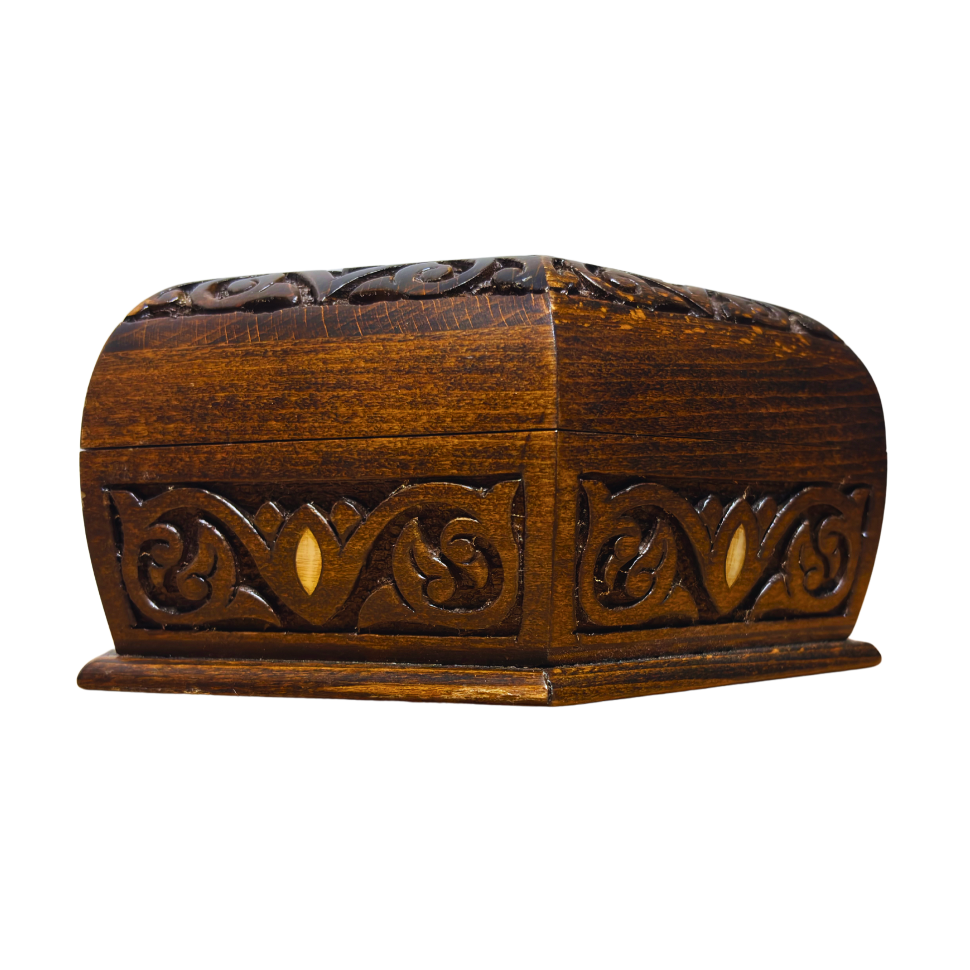 Diese kunstvoll geschnitzte Schatulle steht für eine gehobene Stufe syrischer Handwerkskunst aus Damaskus und ist direkt unter der Mashghal-Arabi-Tradition angesiedelt. Jede Schatulle wird von Hand geschnitzt und mit echter Perlmuttintarsie veredelt.
