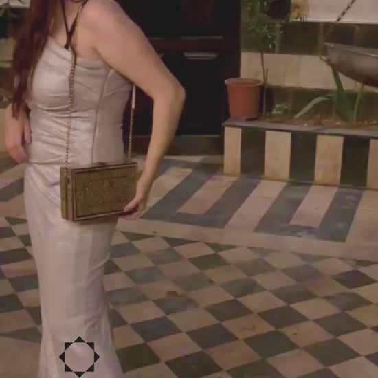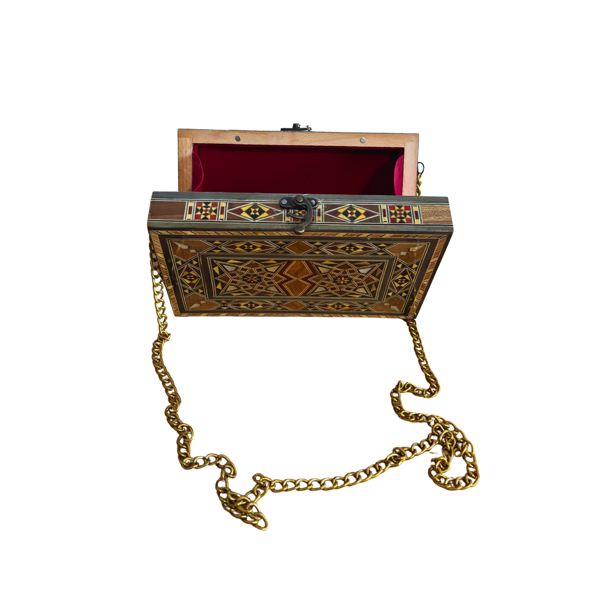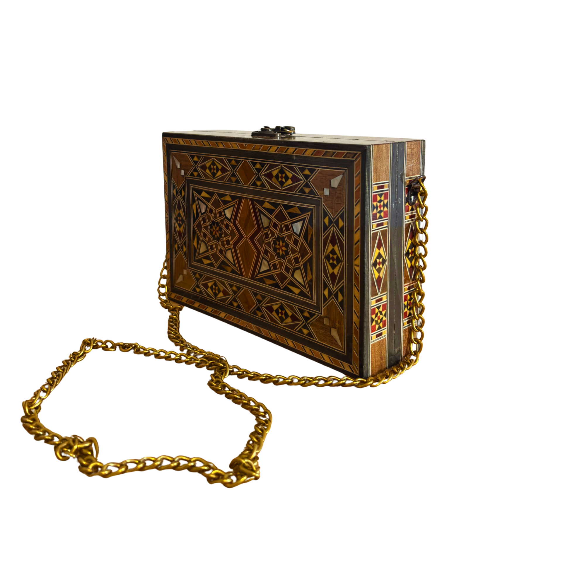 Damaszener Handtasche, Perlmuttintarsien, orientalische Holzkunst, syrisches Kunsthandwerk, Luxus-Abendtasche, goldene Kette, Damascus Box