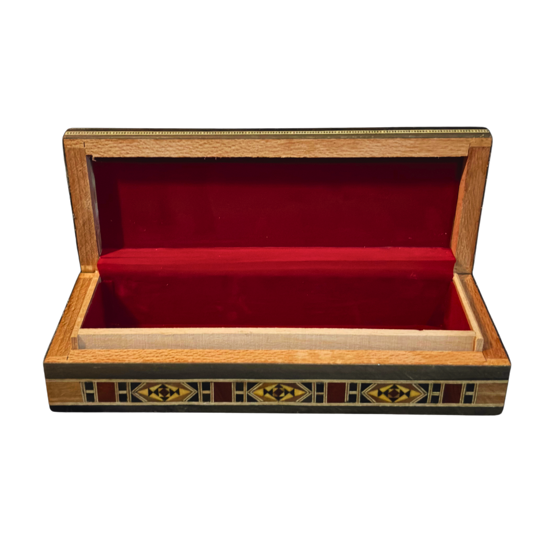 handcrafted mosaic wood box, long rectangular inlay box, mother of pearl pen box, Syrian mosaic jewellery box, wooden keepsake chest, elegant handmade gift, Arabic geometric décor, oriental art box, artisanal storage box, Damascus box, Syrian box, gift for her, gift for him