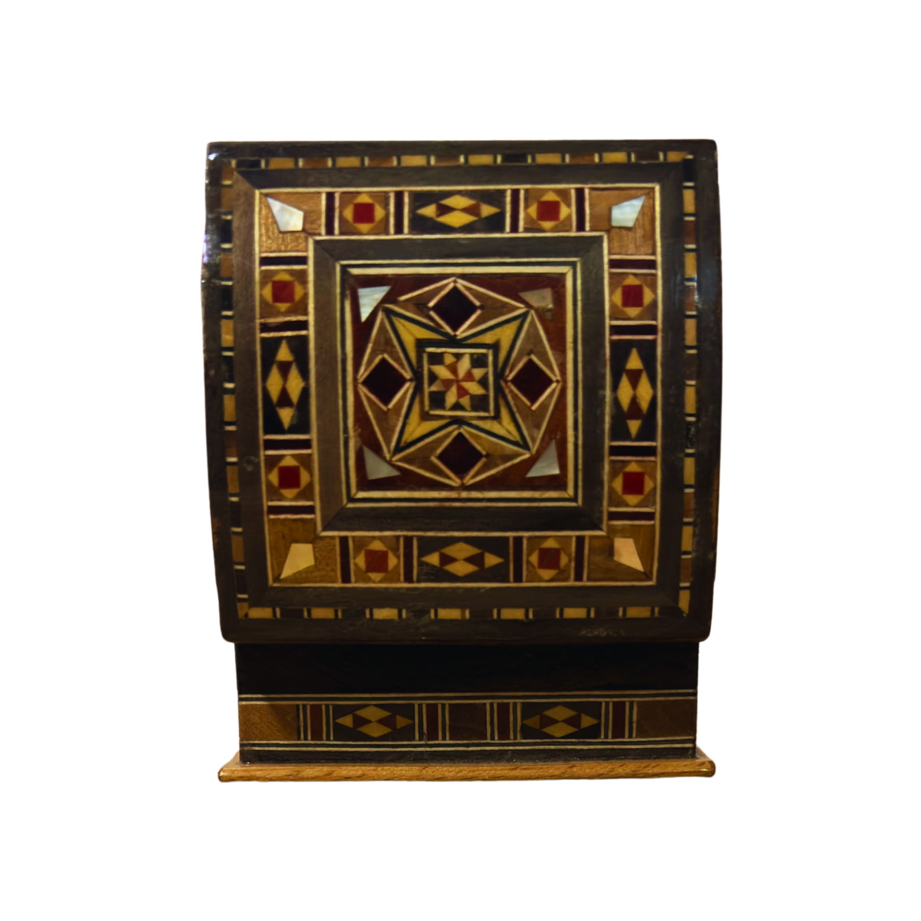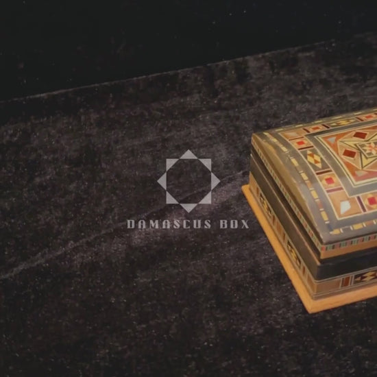 Esta caja de mosaico refleja la tradición artesanal de Damasco, reconocida por sus patrones geométricos precisos y el uso armonioso de maderas naturales. Cada pieza está elaborada a mano con gran cuidado, preservando un legado artístico auténtico.