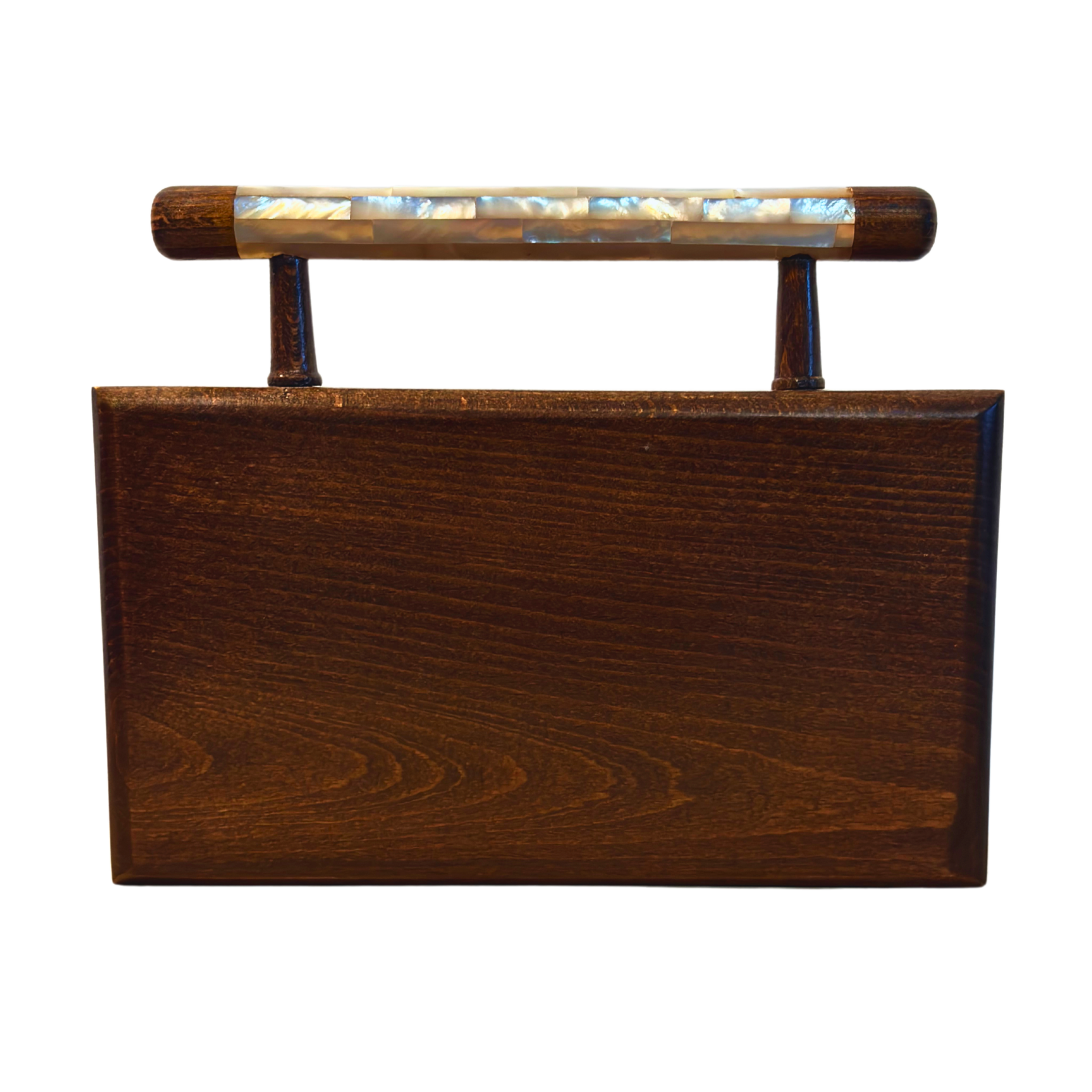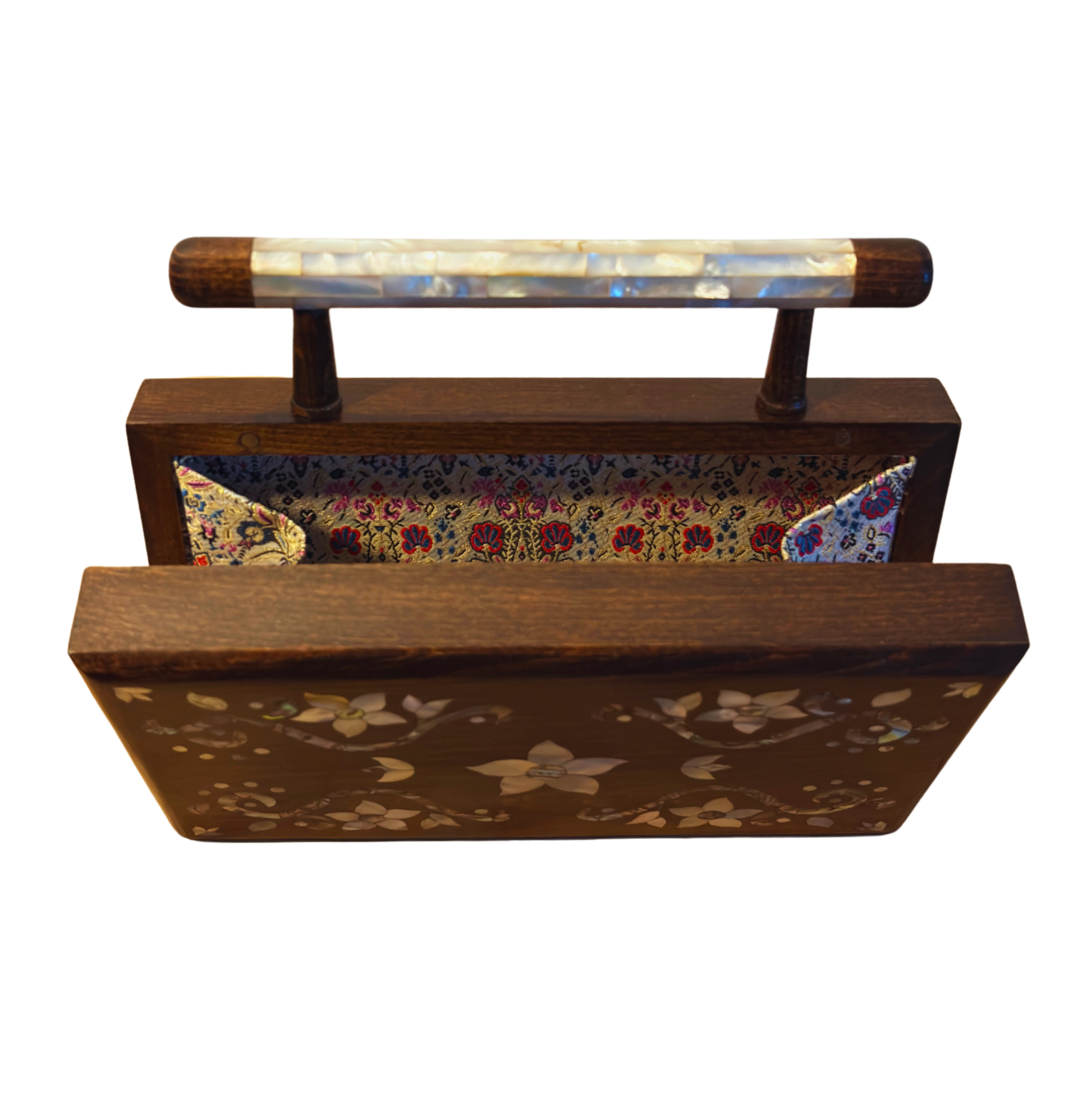 Realizzata in legno di noce e decorata con intarsi floreali in madreperla, riflette la delicatezza dell’artigianato siriano.