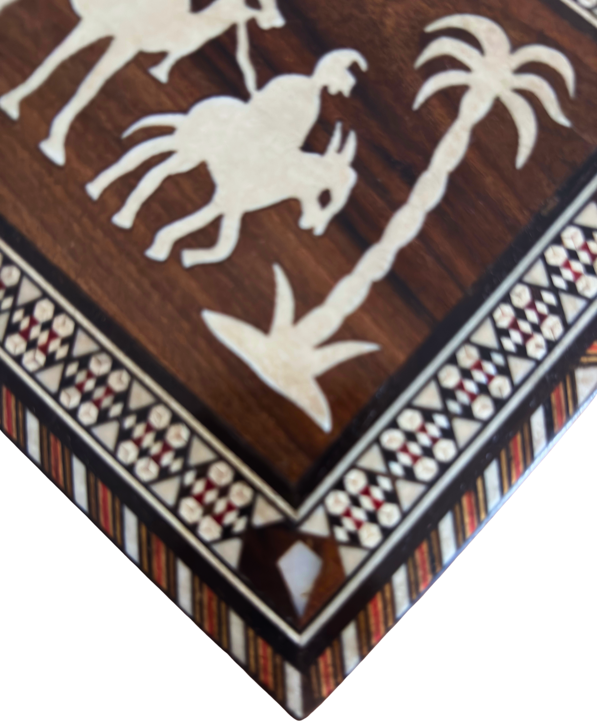 Questa rara scatola vintage in mosaico damascato di medie dimensioni del 1970 sfoggia un'arte senza tempo con le sue calde tonalità terrose e il sottile contrasto che evoca il fascino di un'epoca passata. Realizzata in legno di noce, faggio, limone e pino giallo, il coperchio presenta una scena dettagliata di due cammelli guidati da un beduino a dorso d'asino , accompagnati da un'elegante palma da dattero che cattura lo spirito della tradizione desertica mediorientale.