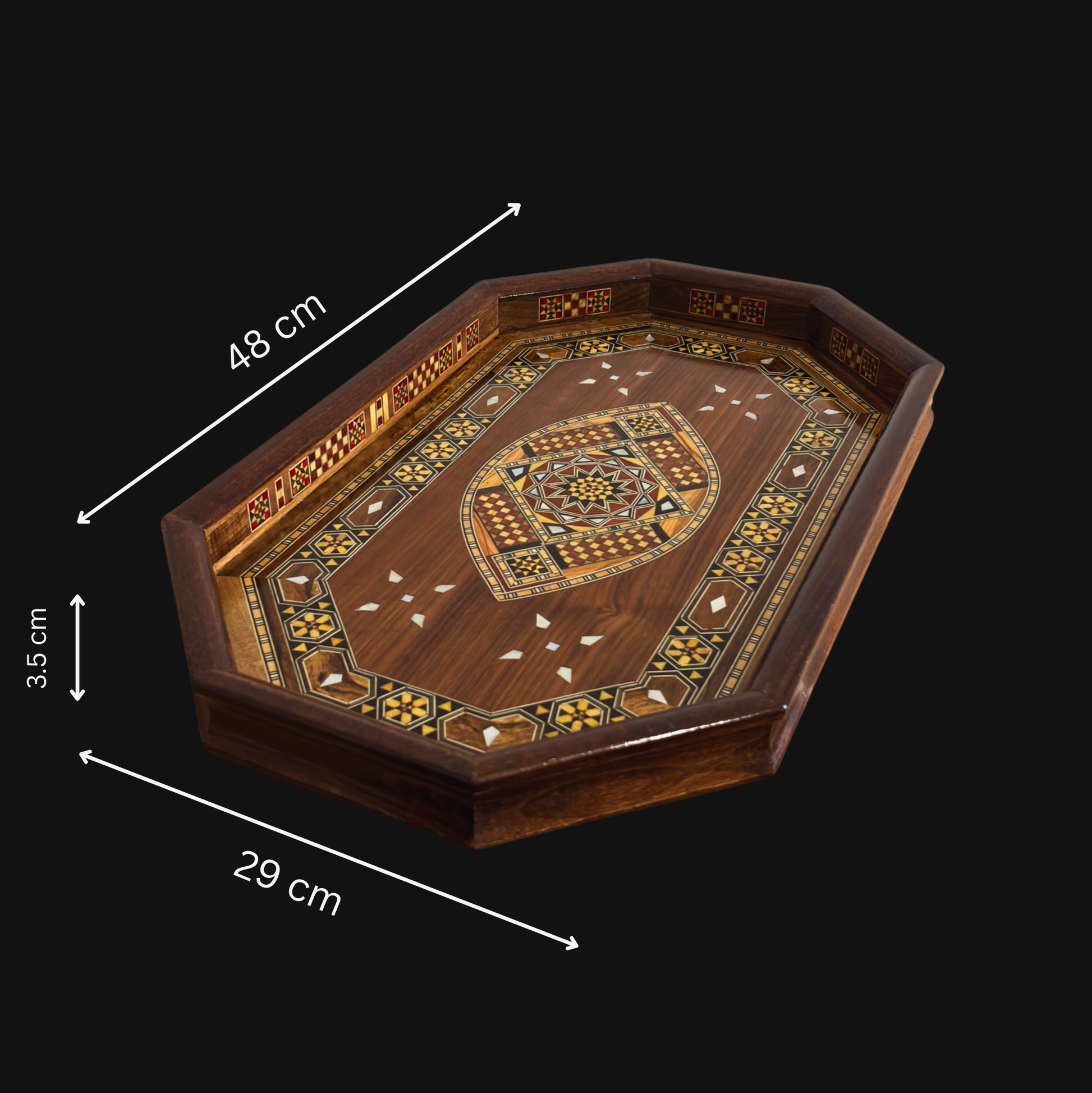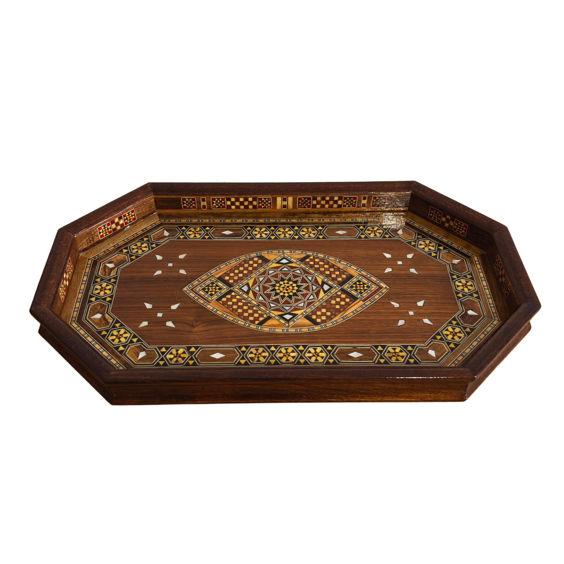 vassoio damaschino, madreperla, design ottagonale, finitura in noce, arte siriana, mosaico orientale, Damascus Box