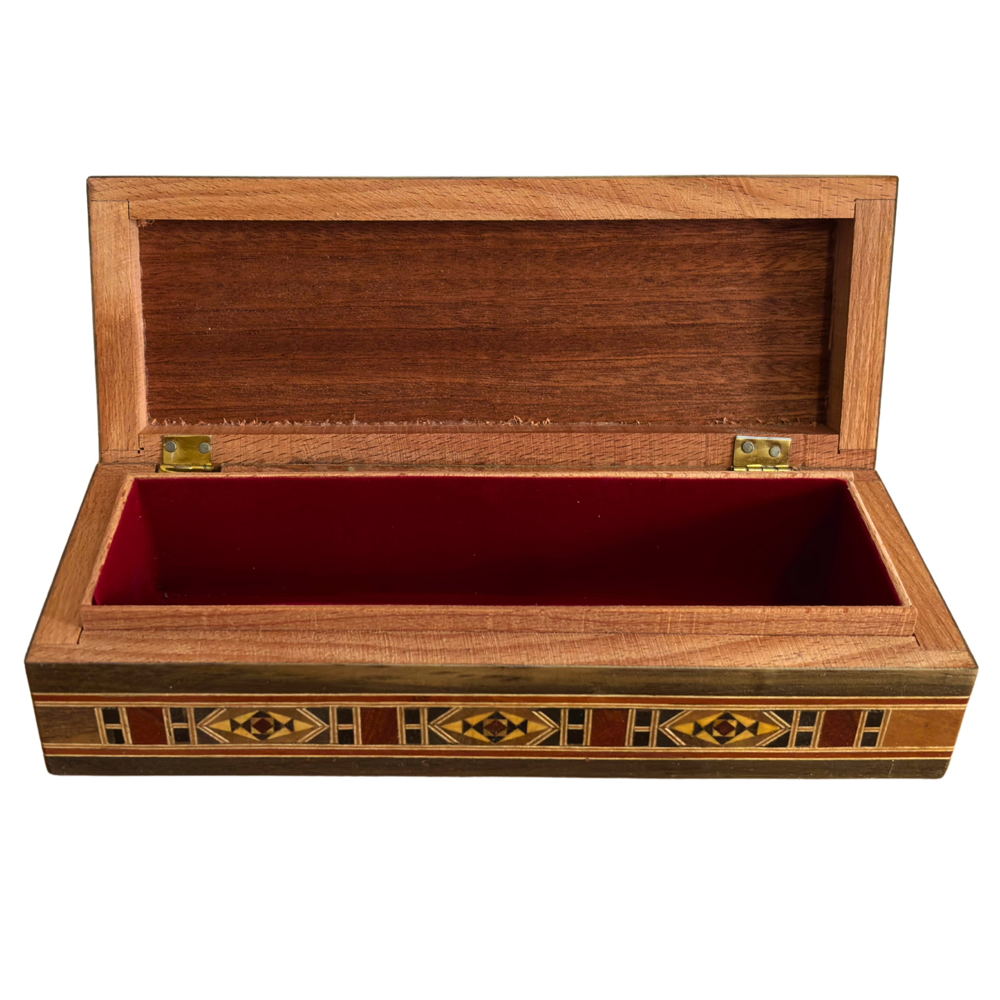 Langwerpige handgemaakte Damascene mozaïekdoos voor pennen en sieraden, parelmoer ingelegd, Syrisch oosters vakmanschap