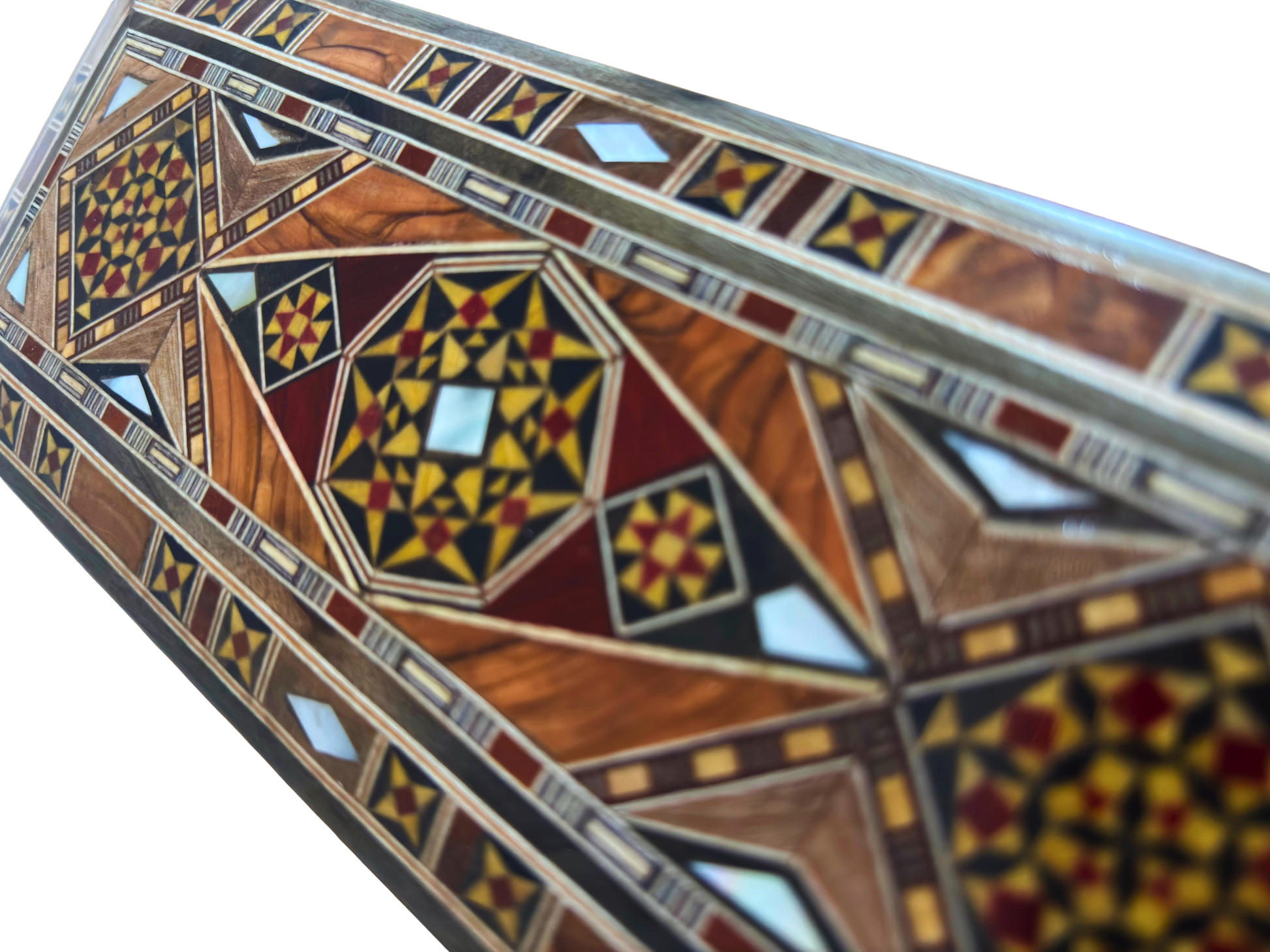 Geef je interieur een artistiek accent met deze prachtige handgemaakte Damasceense mozaïekdoos. De langwerpige rechthoekige vorm is zowel praktisch als stijlvol. Deze doos is vervaardigd van walnoot-, beuken-, citroen- en geel dennenhout, en ingelegd met glinsterend parelmoer in traditionele geometrische patronen uit de Syrische kunst.