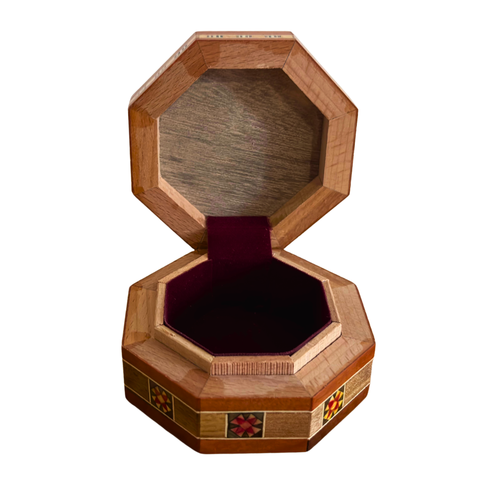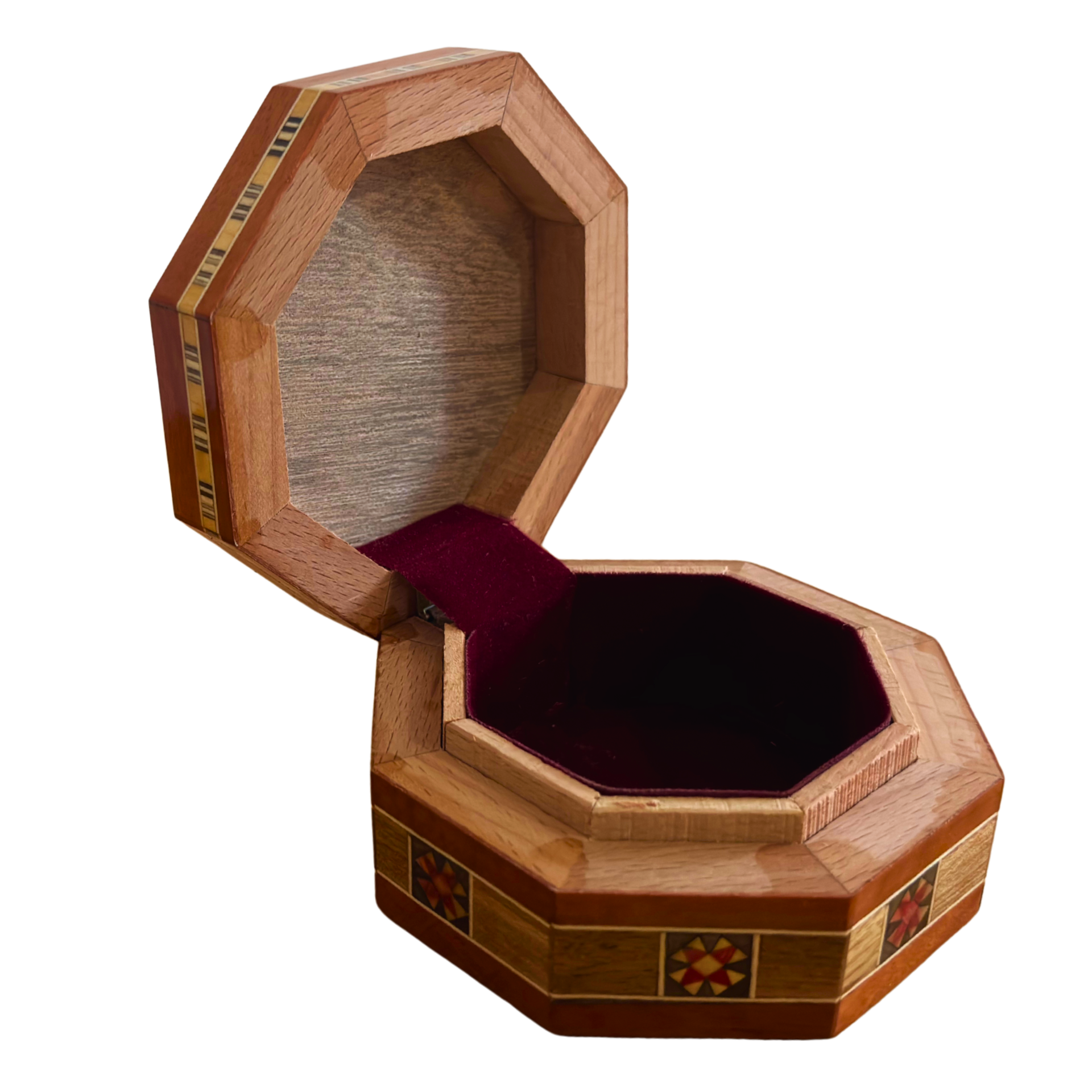 Octagonale damasceense mozaïek sieradendoos – Handgemaakt hout met parelmoer inleg in warme rustieke terracotta