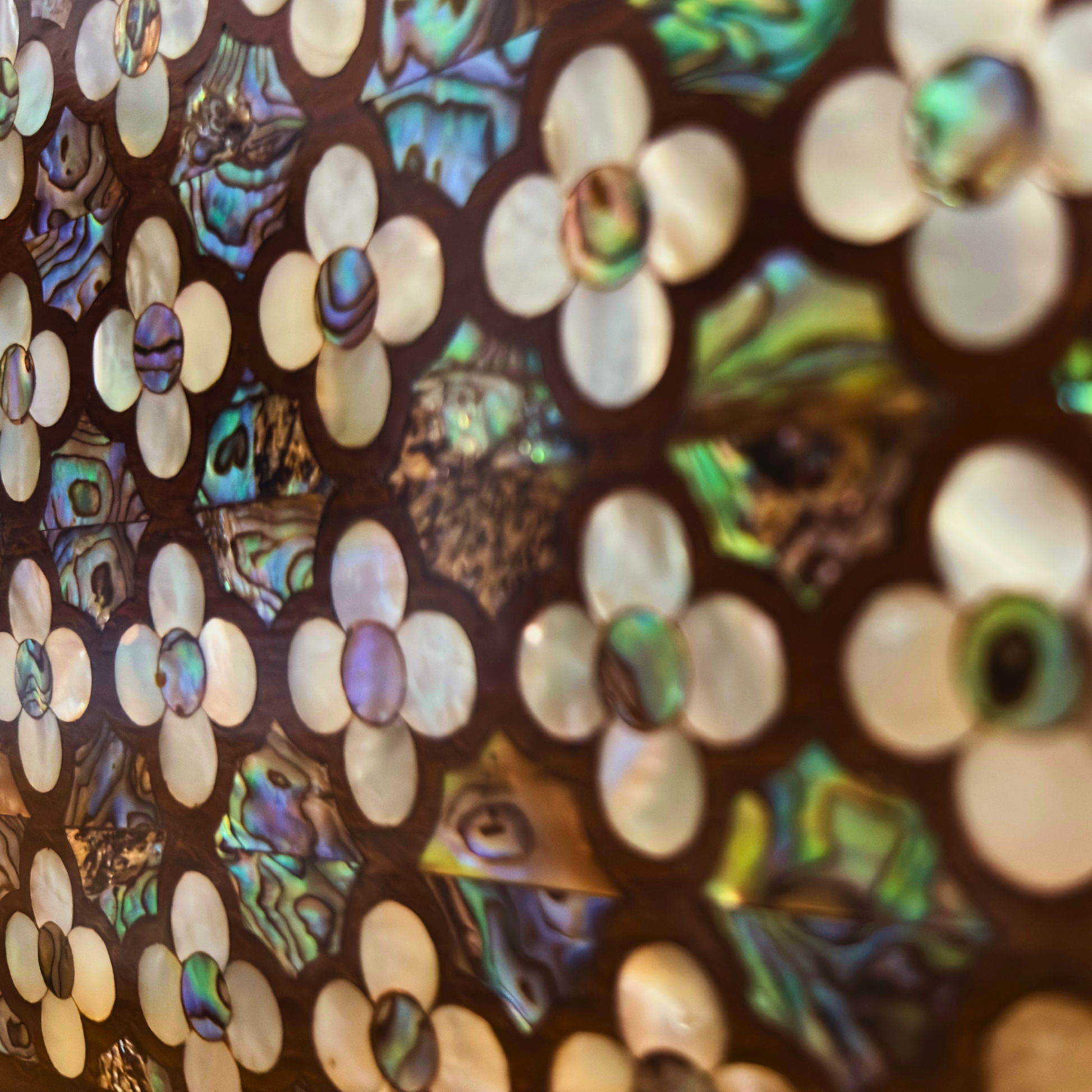 Ręcznie wykonana z wysokiej jakości drewna orzechowego i ozdobiona delikatnymi motywami róż z masy perłowej — kobieca finezja ukształtowana przez mistrzów rzemiosła z Damaszku.