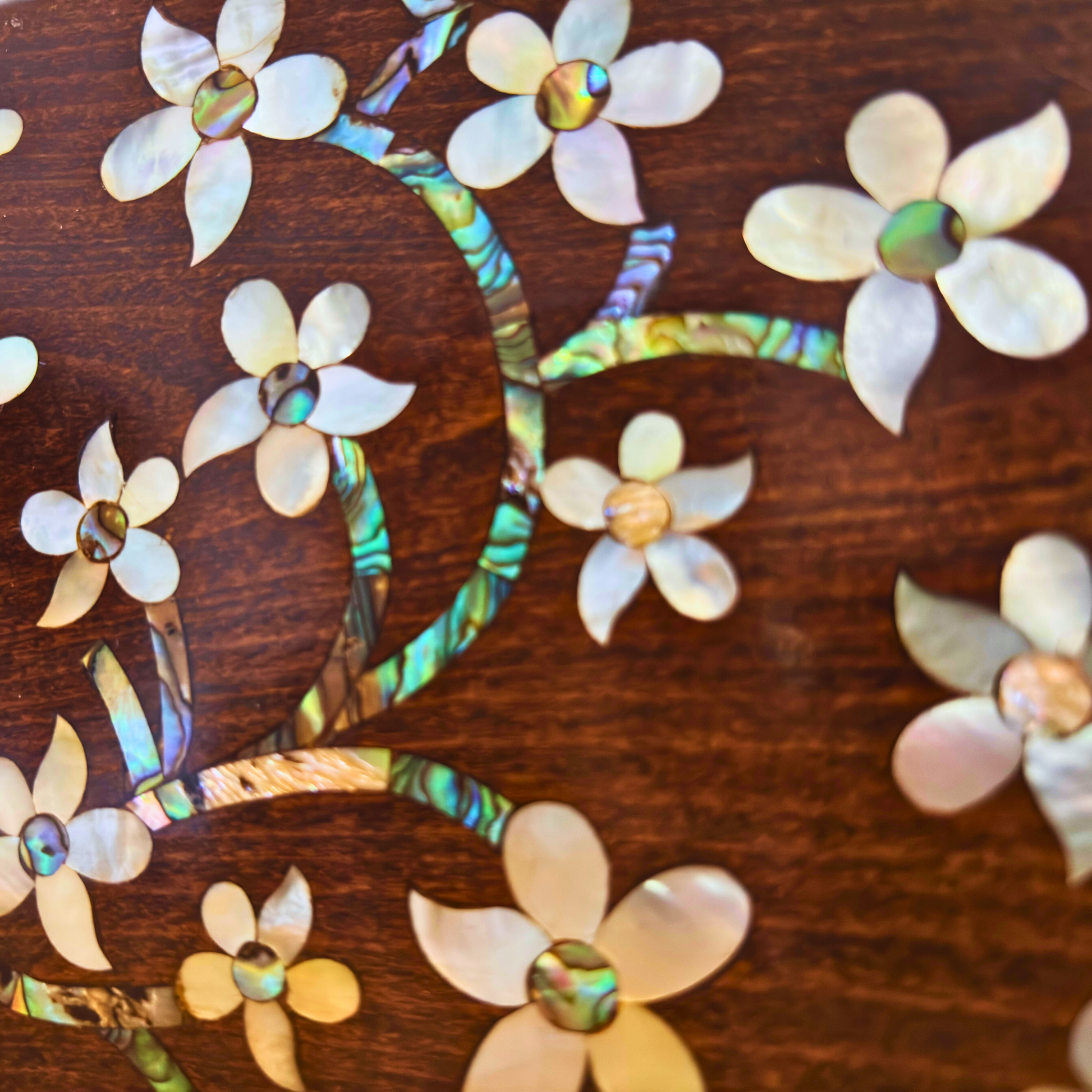 Ręcznie wykonana z drewna orzechowego, zdobiona mozaiką z masy perłowej, ukazuje kunszt orientalnego rzemiosła.