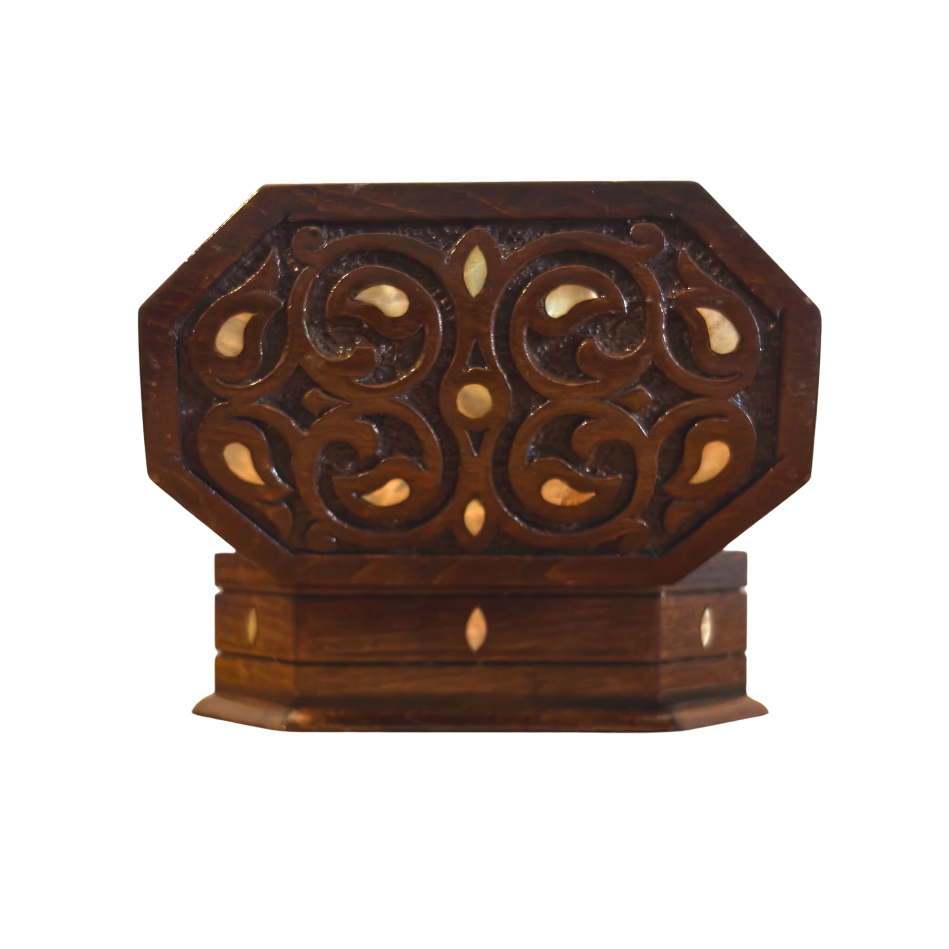 Ręcznie Rzeźbione Pudełko z Buku – Masa Perłowa i Wykończenie Orzechowe