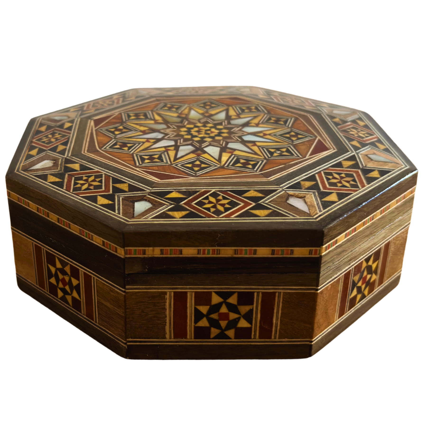Odkryj niezwykłe piękno tego ośmiokątnego, średniego pudełka mozaikowego z Damaszku, starannie wykonanego ręcznie z wysokiej jakości drewna orzecha, buka, cytryny i żółtej sosny, z efektowną intarsją z prawdziwej masy perłowej. To eleganckie pudełko łączy tradycyjne rzemiosło z wyrafinowanym wzornictwem, stanowiąc wspaniałe miejsce na biżuterię, pamiątki lub inne cenne drobiazgi.