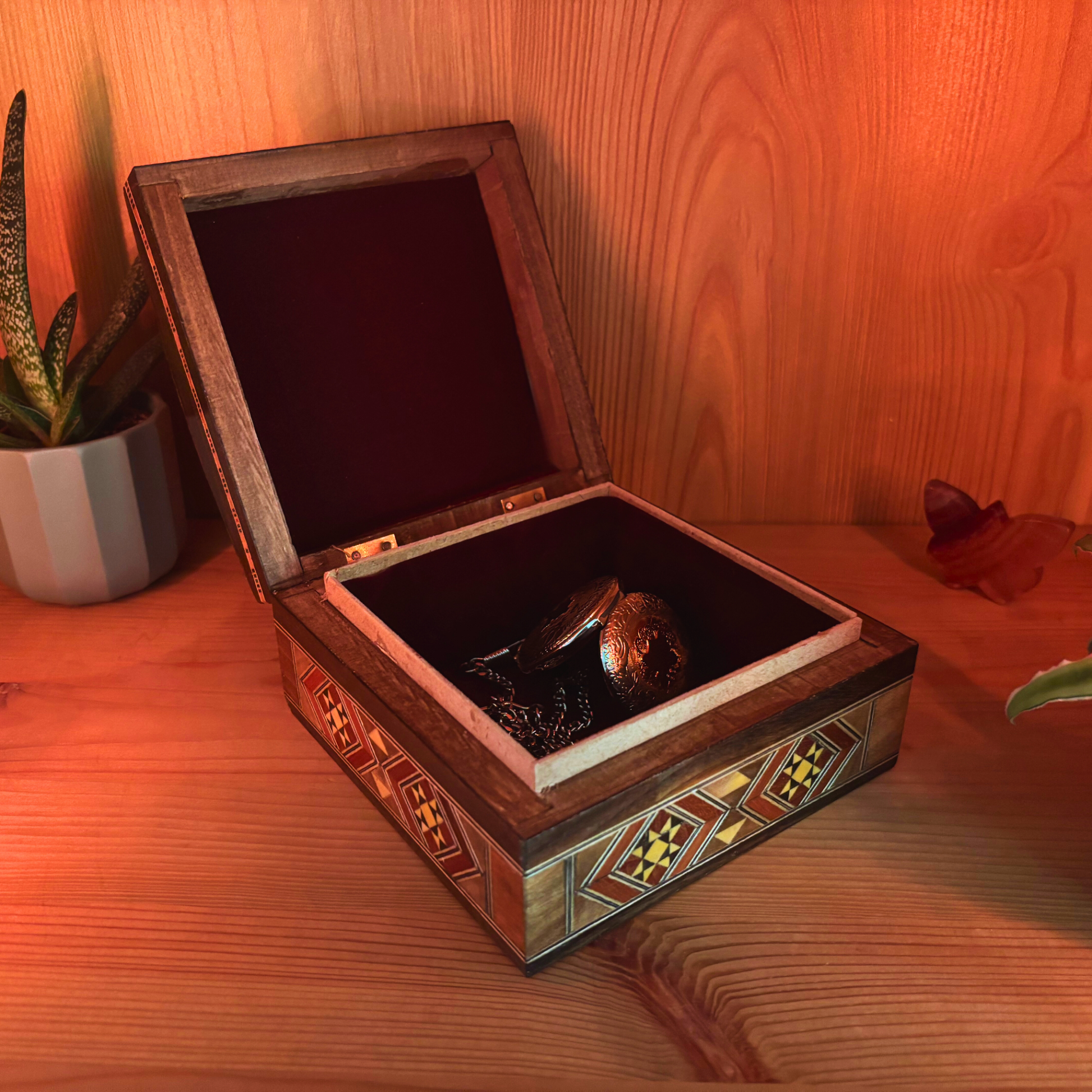 małe pudełko na biżuterię z mozaiką, ręcznie wykonane pudełko drewniane, pudełko z intarsją damasceńską, orientalne pudełko na pamiątki, drewniane pudełko na drobiazgi, pudełko prezentowe z masą perłową, kwadratowe drewniane pudełko, arabska mozaikowa skrzynka, syryjskie rękodzieło, unikalny prezent świąteczny, rzemieślnicze pudełko walentynkowe, pudełko z Damaszku, syryjskie pudełko, prezent dla niej, prezent dla niego