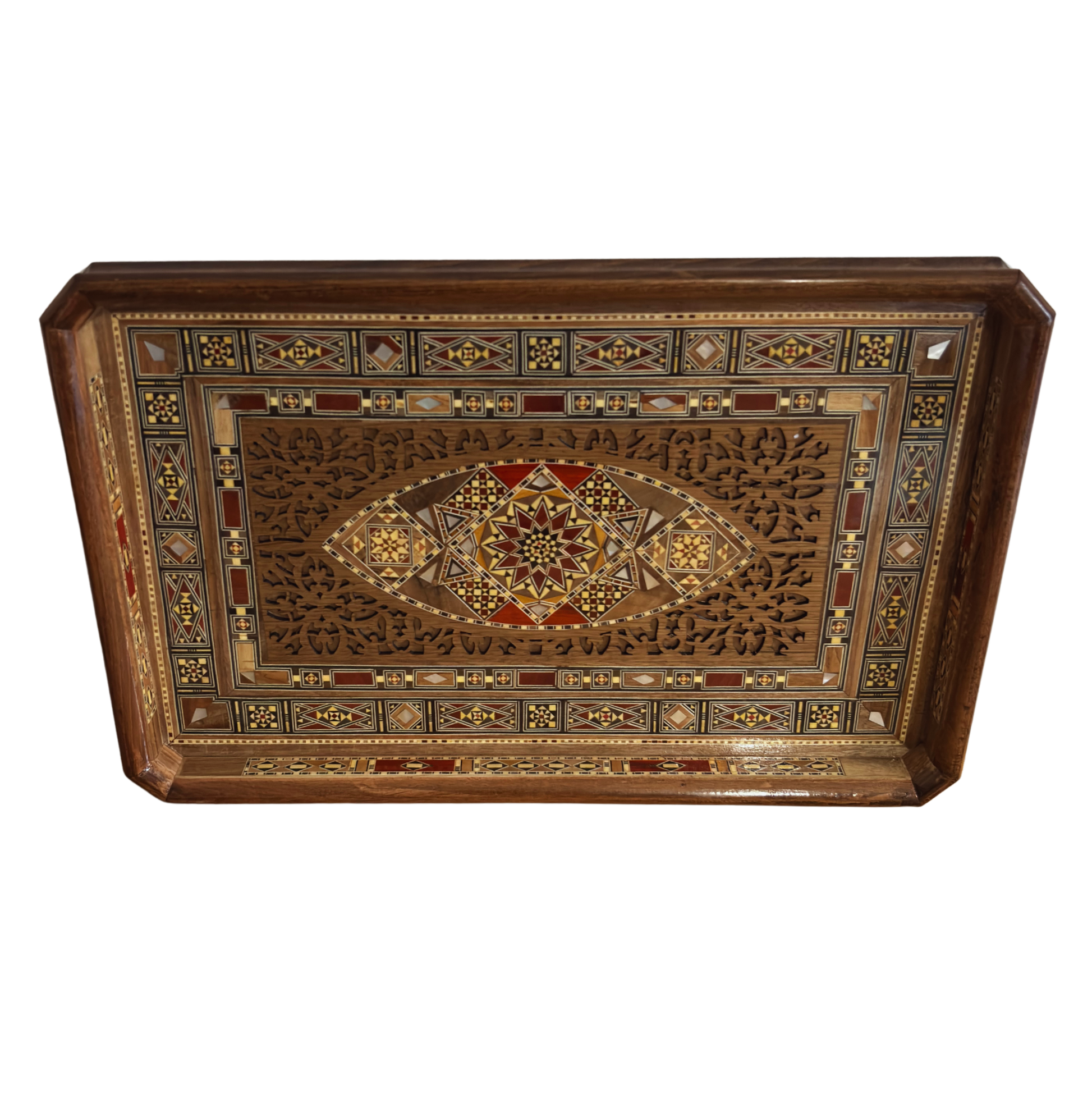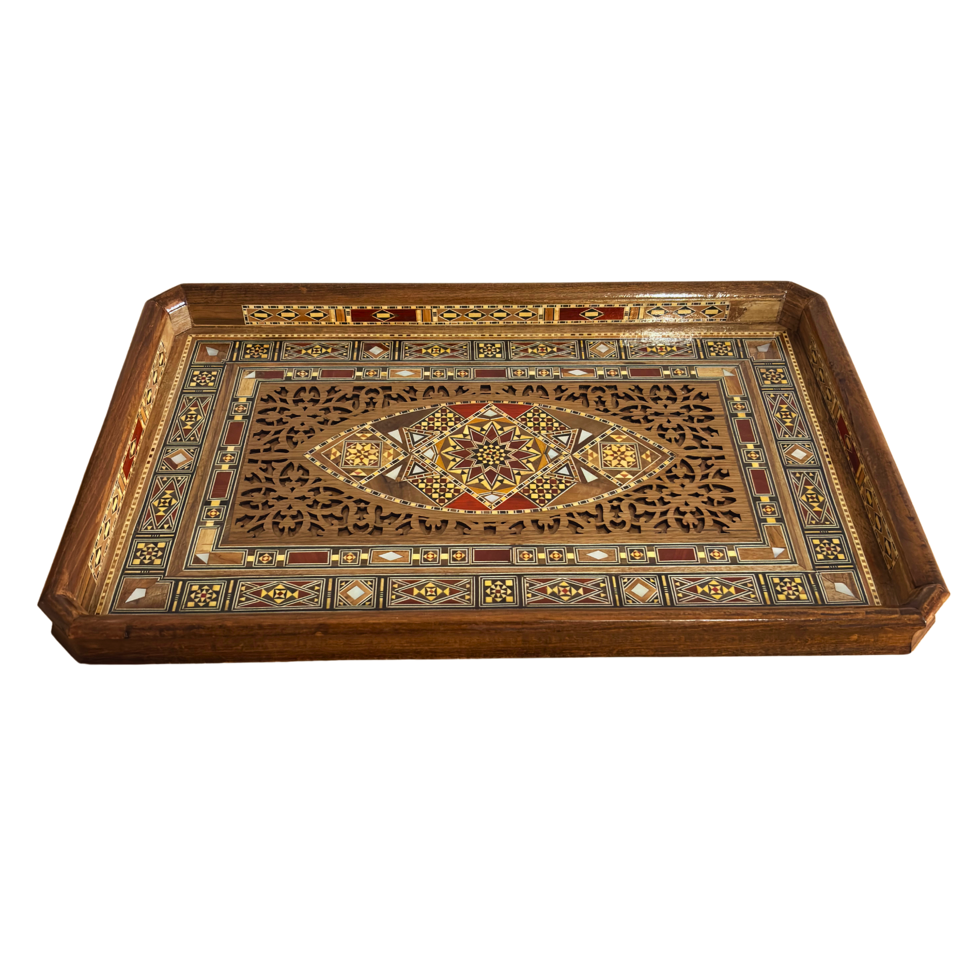 Damasceńska Mozaikowa Drewniana Taca – Masa Perłowa & Naturalne Kolory Drewna