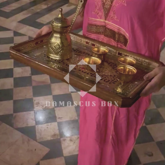 Ta wyjątkowa ręcznie wykonana taca mozaikowa ukazuje mistrzostwo tradycyjnej sztuki damasceńskiej.